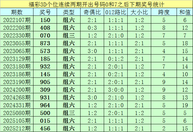 个位号码:最近两期个位开出号码为0-7,在福彩3D历史开奖中,前后两期个位分别开出号码0-7的奖号出现了99次。最近15期个位0-7组合出现之后,其下期奖号分别为:150-408-070-873-573-185-932-145-905-309-931-964-500-015-456;