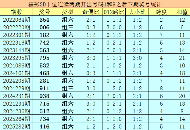 十位号码:前两期十位分别出现奖号1-9,历史上福彩3D连续前后分别开出号码1-9的现象共开出79次。在十位1-9的现象出现时,最近15期其下期分别开出号码:354-006-182-742-563-795-532-468-281-911-938-715-512-734-416;