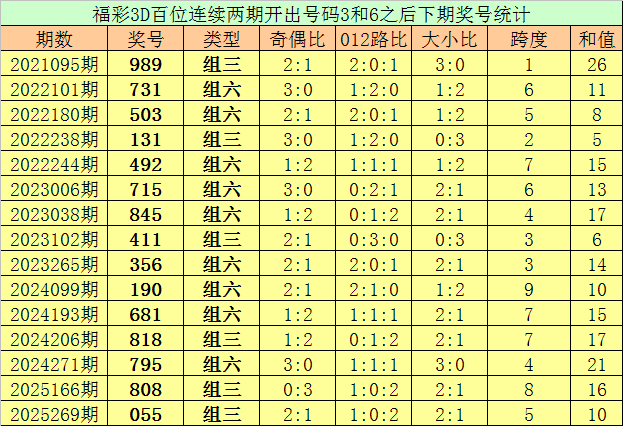 百位号码:连续两期百位出号分别为:3-6,历史上福彩3D连续两期前后分别出号3-6的奖号共出现108次。在百位3-6的奖号现象出现时,近15期下期分别出号:989-731-503-131-492-715-845-411-356-190-681-818-795-808-055;