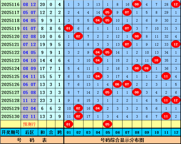 后区分析:上期后区开出号码02和11,最近10期后区奖号奇偶比为8:12,大小比为11:9,本期后区看好号码01、05、06、07、08,后区单挑两码01、05。