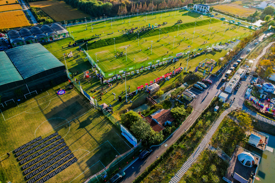 秋日的奉贤南桥镇江海村,稻浪翻金,芦花摇曳。田间地头坐落着几座银白色的“魔方”,镜面折射着天光云影,芦苇丛中竹筏轻浮,翠绿的网球场中央,稻草编织的“麦浪”随风起伏,一束“铃兰”贴着湛蓝的天壁绽放——这些场景并非都市美术馆的巡展,而是“摩登田野2025新海派乡村艺术节”的现场。