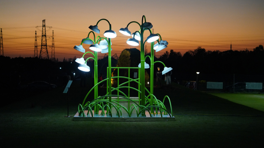 法国南特大西洋设计学院的《铃兰》最是吸睛 —— 绿草丛间,底部的镜面将天光与草影交织,流动的光线让这朵象征法国春日的花,在江南田野里生出 "脆弱与坚韧并存" 的诗意。