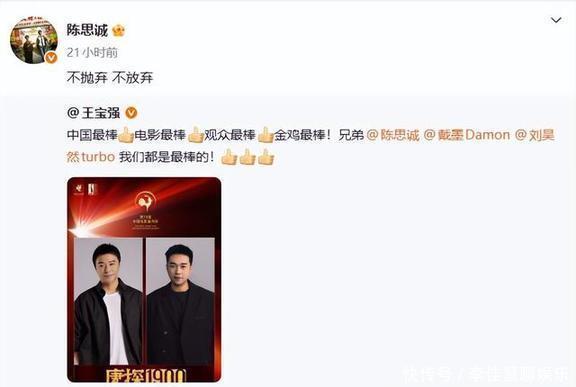 虽然,这次他凭藉自己导演的作品《唐探1900》,拿到了金鸡奖最佳导演的奖杯,但是,在庆祝自己拿奖的他也不忘引用王宝强的动态。