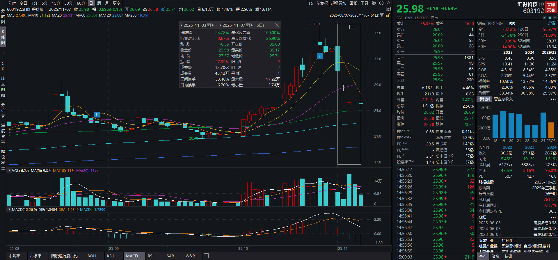 二级市场方面,汇得科技11月3日-11月4日连续两日跌停,近一周累计跌幅近25%。